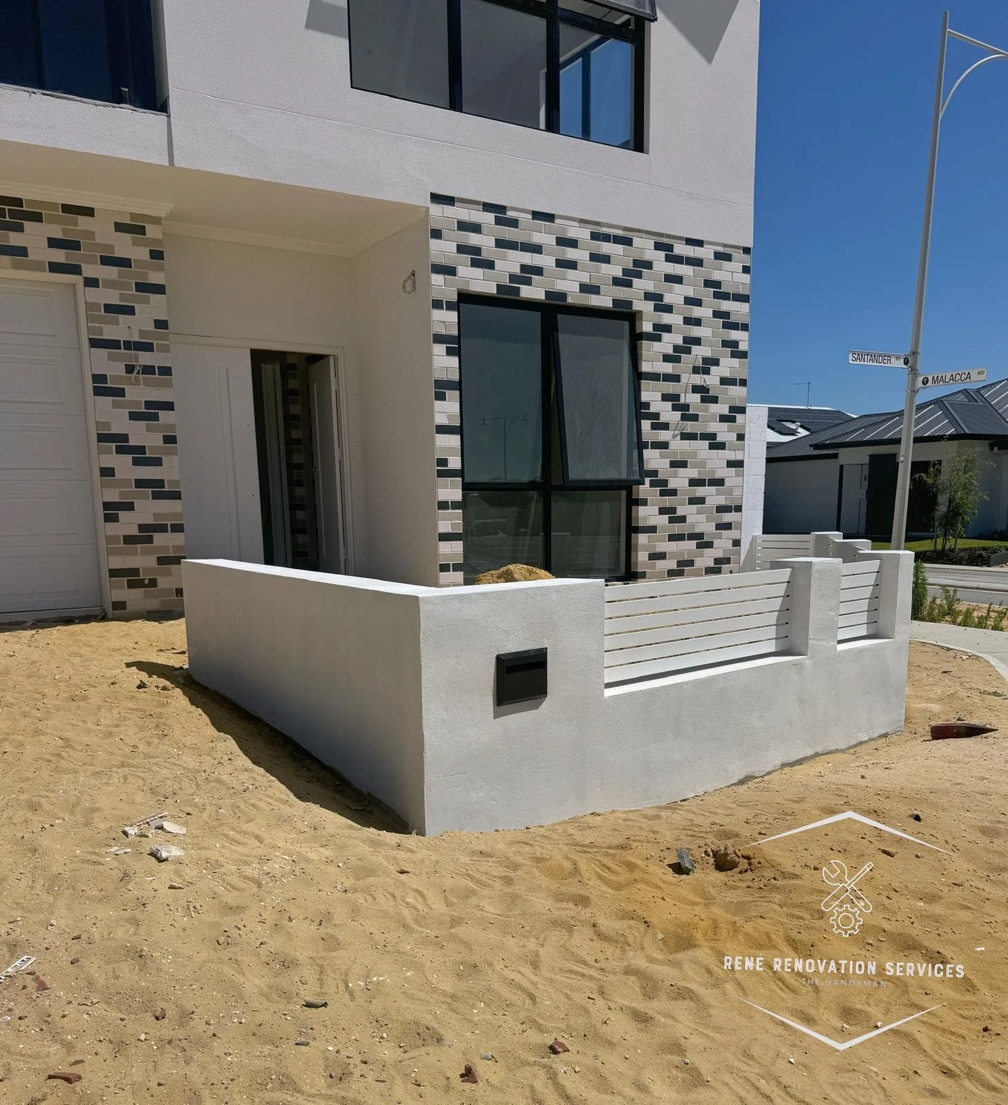 The letterbox was constructed with a solid masonry base and finished with a smooth rendered surface for a clean, architectural look. A recessed mail slot and house numbering were built into the wall to create a seamless and secure design.